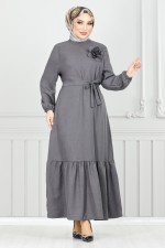 Broş Gül Detaylı Elbise 801OZR1047-M Antrasit