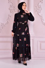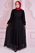 Kuşaklı Dantel Abiye Siyah NEV14926