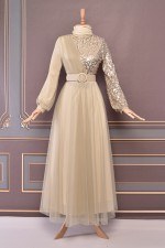 Kemerli Tül Abiye Bej ASM2519