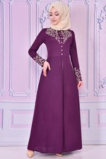 Nakışlı Düğmeli Elbise Mor ASM2158