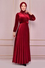 Kemerli Kadife Abiye Bordo NEV14967