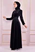 Kemerli Kadife Elbise Siyah NEV15006