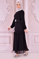 Kemerli Şifon Elbise Siyah END2091