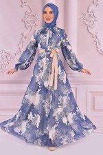 Kuşaklı Şifon Elbise Mavi NEV14312