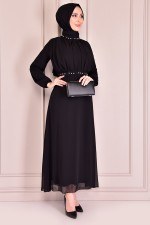 Kuşaklı Şifon Elbise Siyah EFS1221