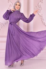İnci Detay Simli Abiye Koyu Lila KBR5063