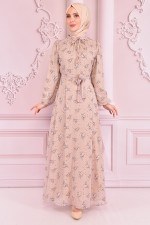 Kuşaklı Şifon Elbise Bej VBR7361