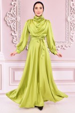 Kuşaklı Saten Abiye Fıstık Yeşili ASM14823