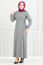 Belden Bağlamalı Tesettür Elbise 22037UKB929-M Gri