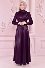 Fiyonklu Saten Elbise Mürdüm ASM2465