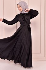 Kuşaklı Saten Elbise Siyah NEV14825