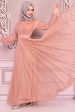 Kuşaklı Tül Abiye Bej LİY2051