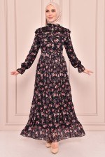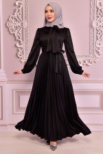 Kuşaklı Saten Elbise Siyah NEV14703