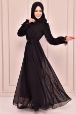 Kuşaklı Dantel Detay Şifon Elbise Siyah NEV14846