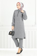 Aksesuar Düğmeli Tesettür Takım 22035UKB929-M Gri