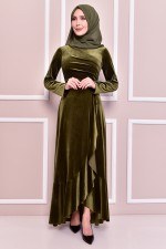 Drape Detay Kadife Elbise Haki KBR21340