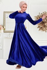 Kuşaklı Kadife Elbise Saks EFY2912