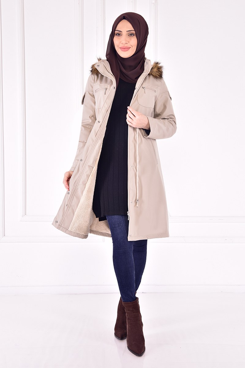 Kapüşonlu Kaban Krem TKN3360
