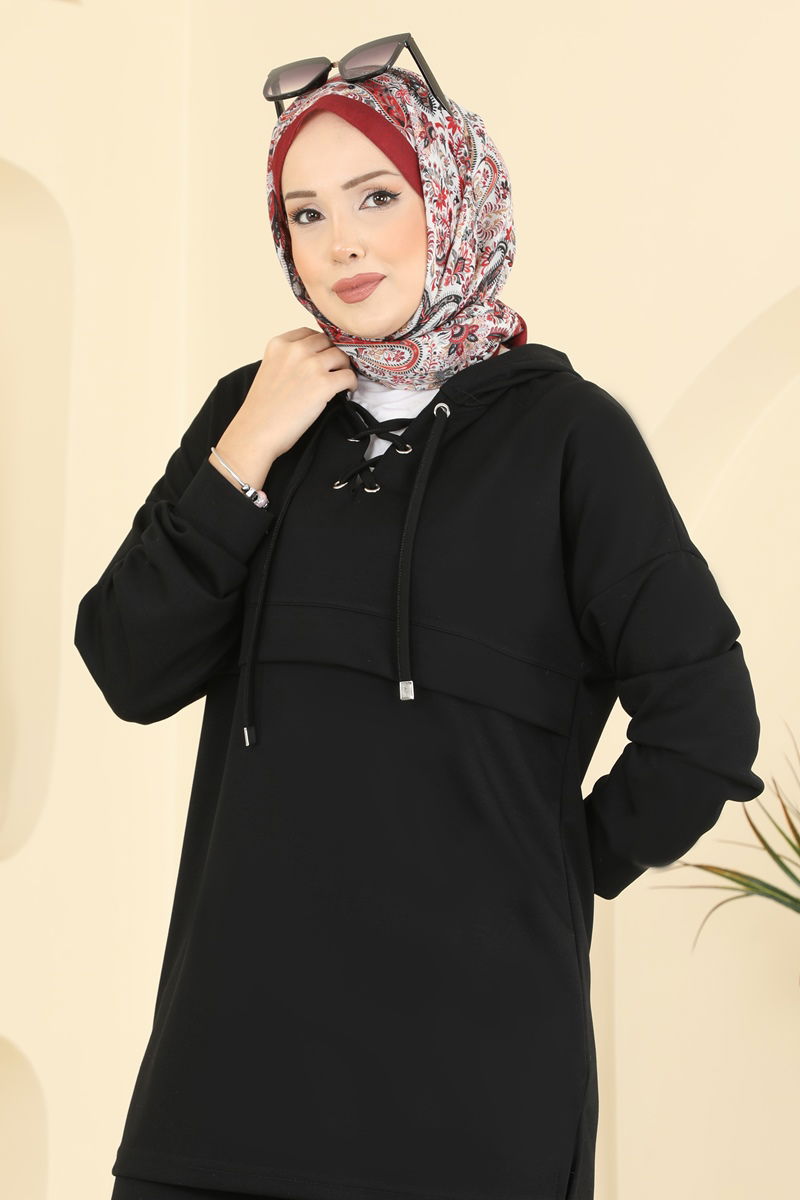 Ürün Detayları: Tesettür modasına uygun yeni sezon ürünüdür. Bağcıklı yaka tasarımı aktiftir. Kapşonlu yaka tasarımına sahiptir. Astar içermemektedir. Kapşon sabittir. Pantolonun beli esnektir. Çekimler sırasında renk farklılıkları yaşanmış olabilir.