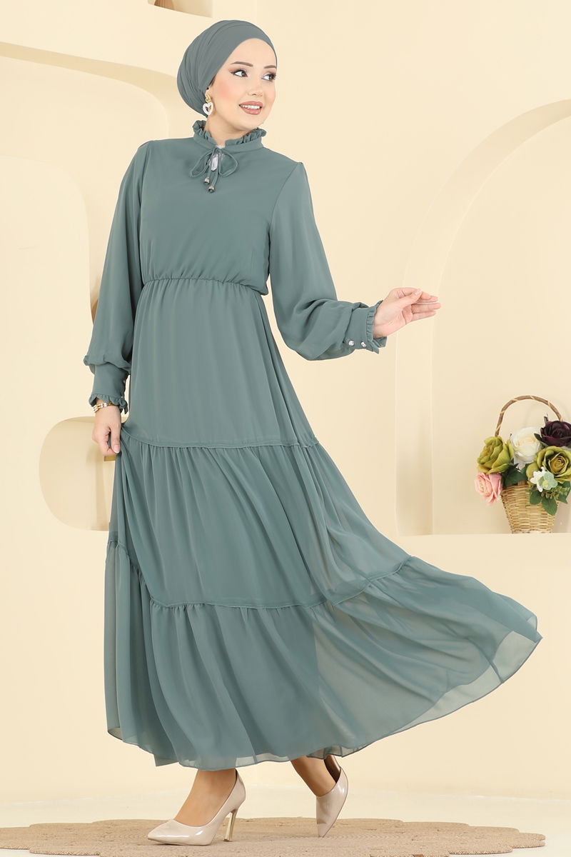 Yaka Bağcıklı Şifon Elbise 6268BSK463-MS Koyu Mint