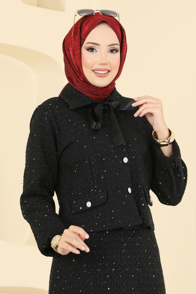 Ürün Detayları : Tesettür modası için özel yeni sezon ürünü. Bağcıklı yaka tasarımlı. Ceket modeli gömlek yakalıdır ve önden düğmelerle kapatılabilir. Astar içermemektedir. Bağcıklar, çıkarılabilir ve isteğe göre ayarlanabilir özelliktedir. Üründe gösterilen bluz dahil değildir; kombin amacıyla eklenmiştir. Ceket üzerindeki cepler dekoratif olarak eklenmiştir. Etek, bel kısmından fermuarla açılıp kapanır.Ürün resimlerinde ışık kaynaklı renk farklılıkları oluşabilir.