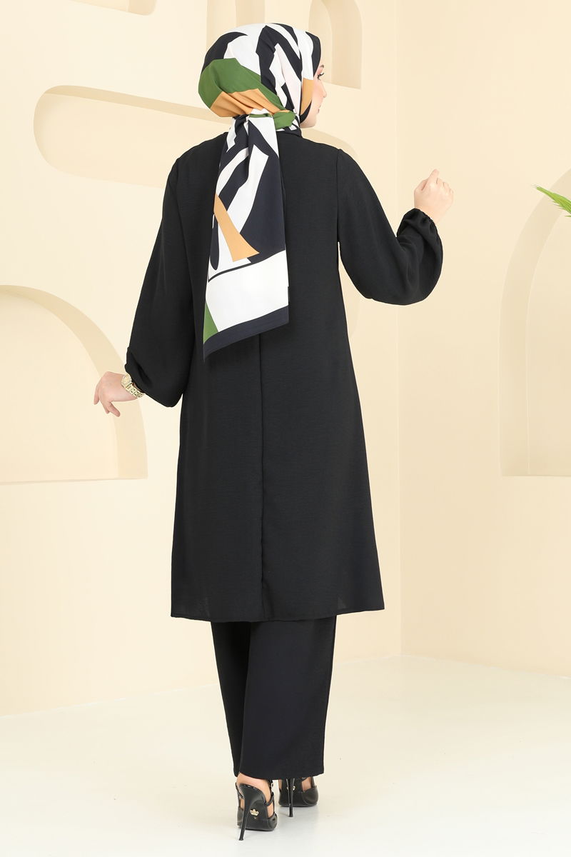Ürün Detayları: Bu ürün yeni sezon tesettür modasına uygun olarak tasarlanmıştır. Üründe arkadan erişilebilen düğme detayı mevcuttur. Bisiklet yaka stili vardır ve yine arkadan düğmeli kapanışa sahiptir. Tunik yan yırtmaçlara sahip olup, iç astarsızdır. Pantolonun beli ve manşetleri esnek lastiklidir. Resim çekimleri esnasında renklerde ufak farklılıklar olabilir.