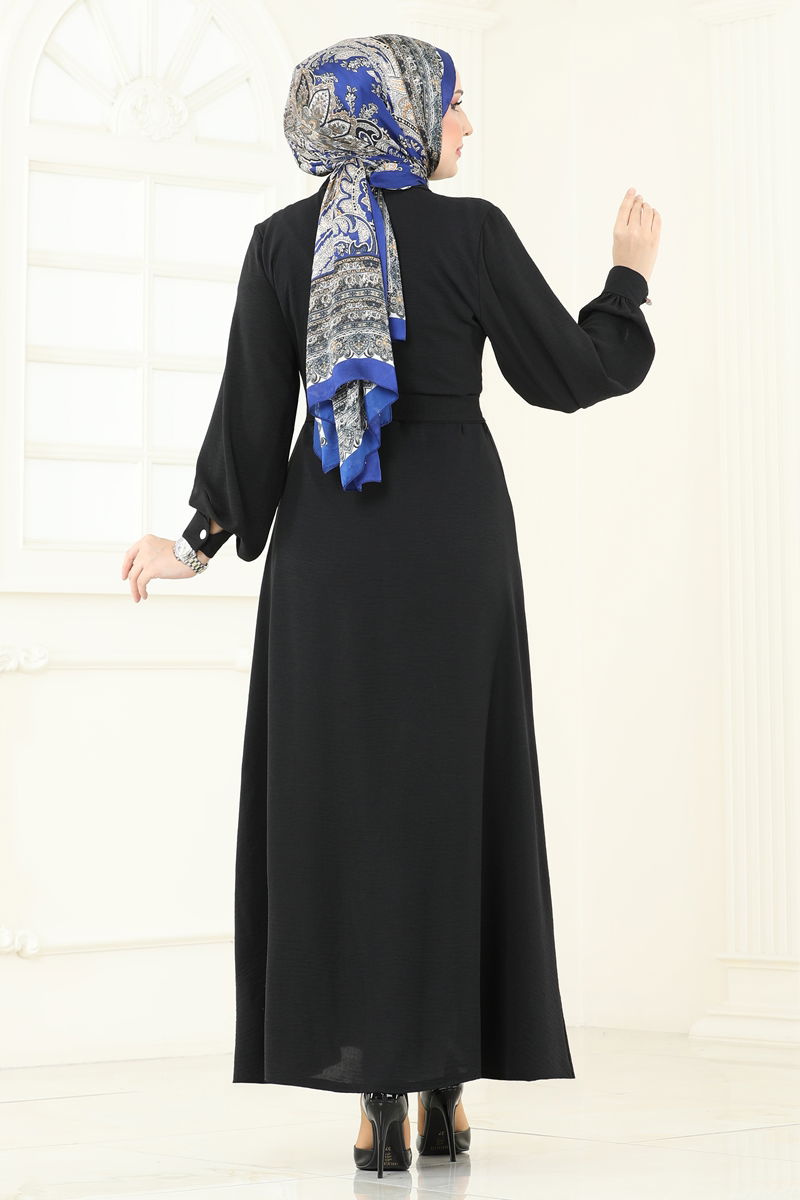 The Pearl Collar Modest Dress, made from aerobin fabric, features a shirt collar and front button design. This dress, suitable for use throughout the four seasons, can be washed at 30 degrees with delicate care. The elegance of the product is enhanced by the pearl details added by the encrusting method. The belt, designed to prevent wavering by stitching the ends, can be optionally removed. The cuff links are functional. The product on the model is size 38 and is unlined.
