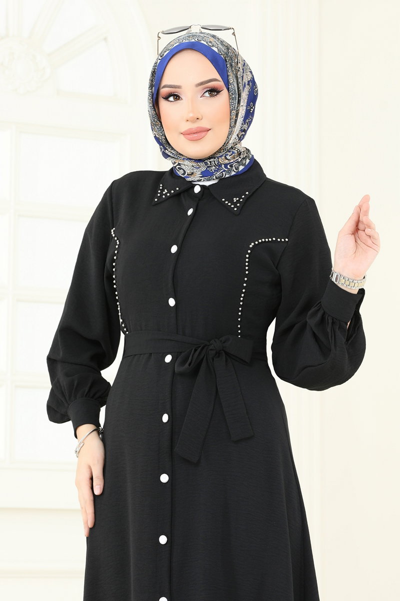 Yakası İncili Tesettür Elbise 316HBS856-MS Siyah