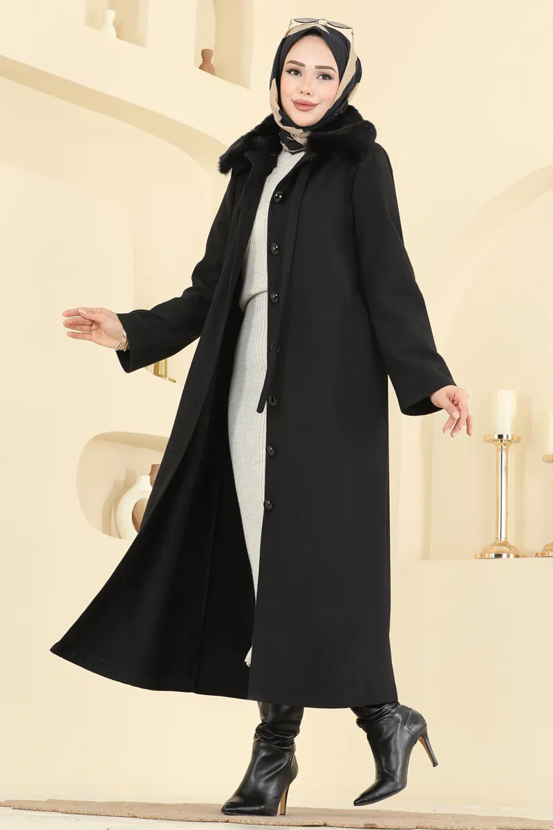 Kürklü Yakalı Siyah Kaşe Kaban
