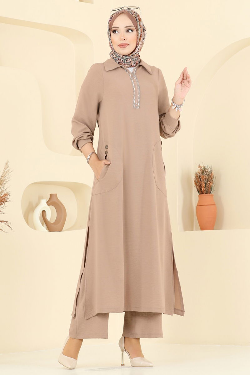 يوجد سحاب نصفي يمكن استخدامه من الأمام. المنتج لديه ياقة القميص. البلوز تحتوي على فتحة. يتم لصق الحجارة. خصر البنطال مرن. قد يكون هناك اختلاف في الدرجة اللونية في المنتج بسبب التقاط الصور الفوتوغرافية.