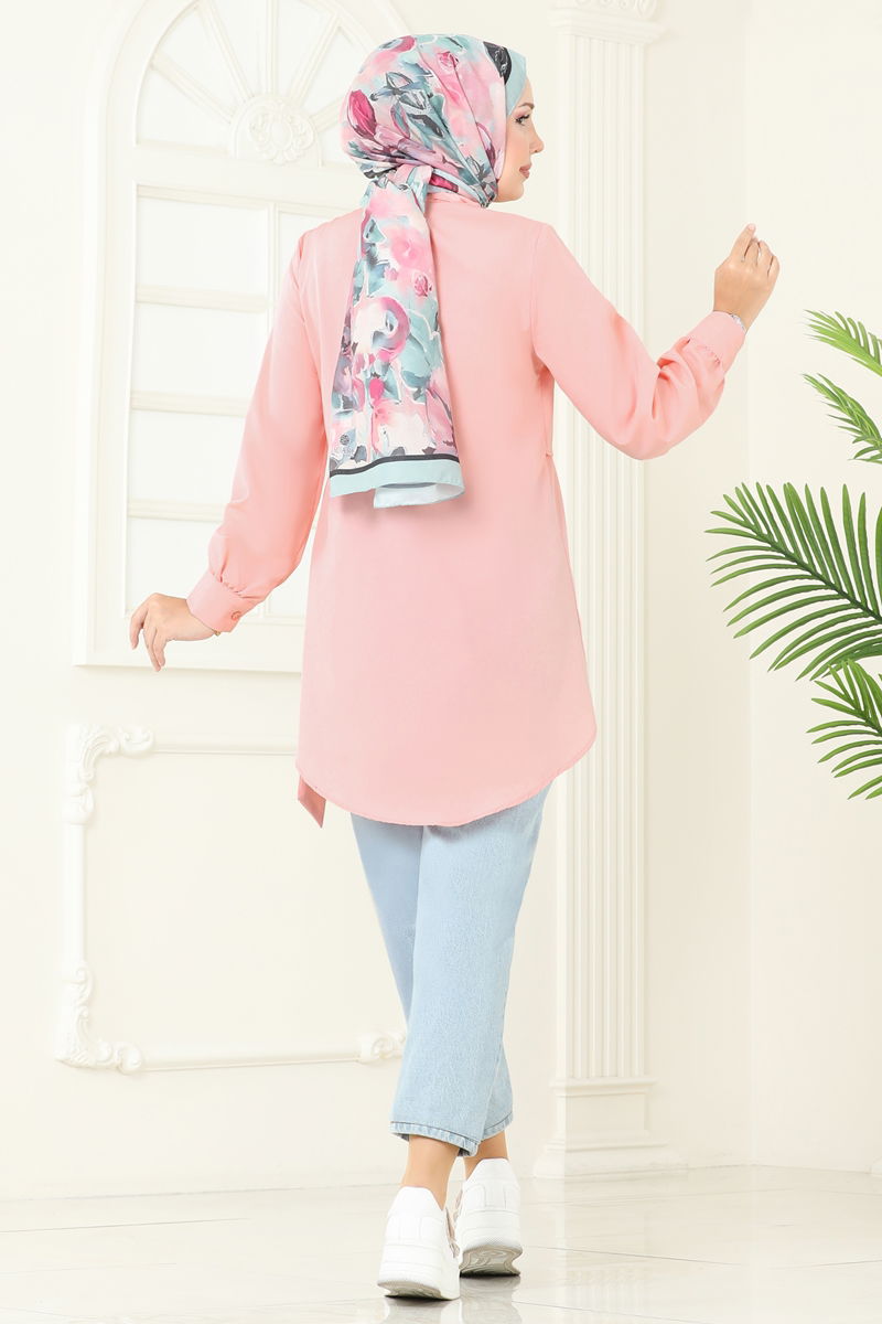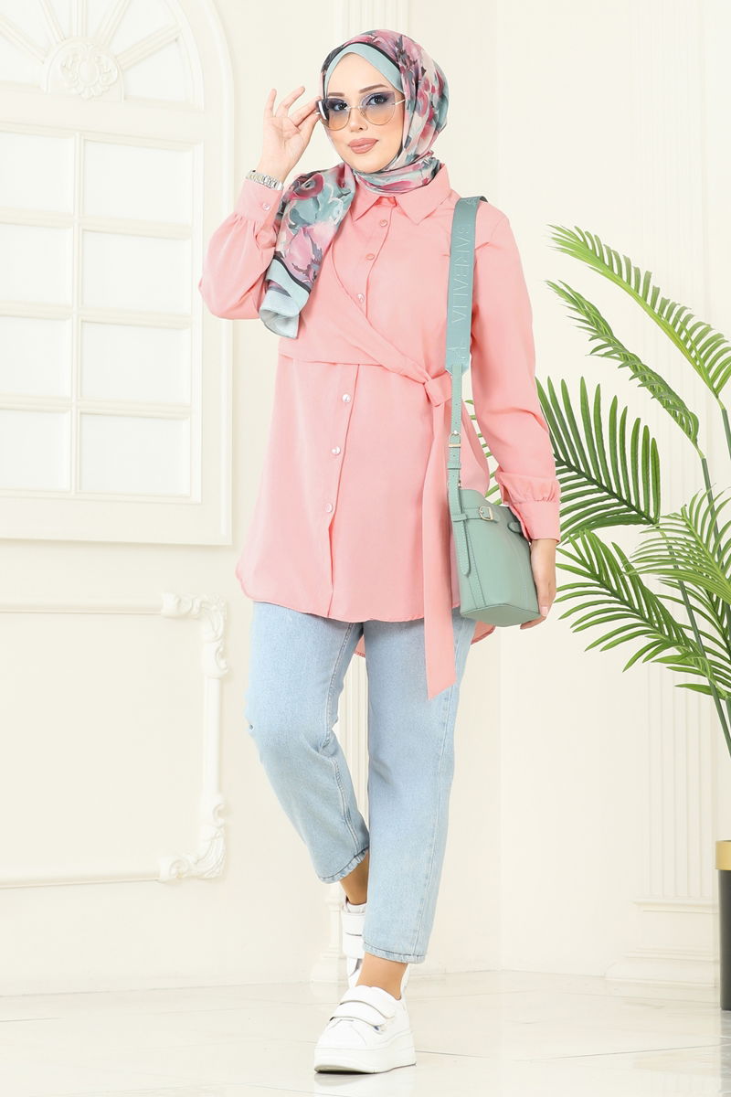 Product Feature : It is a new season hijab fashion product. It has a belt that can be fastened from the side. The product has a Shirt collar. The product has From the front buttons. Unlined. Belt is sewn to the product. Cuff buttons are active. There may be a tonal difference in the product due to concept photo shoots.