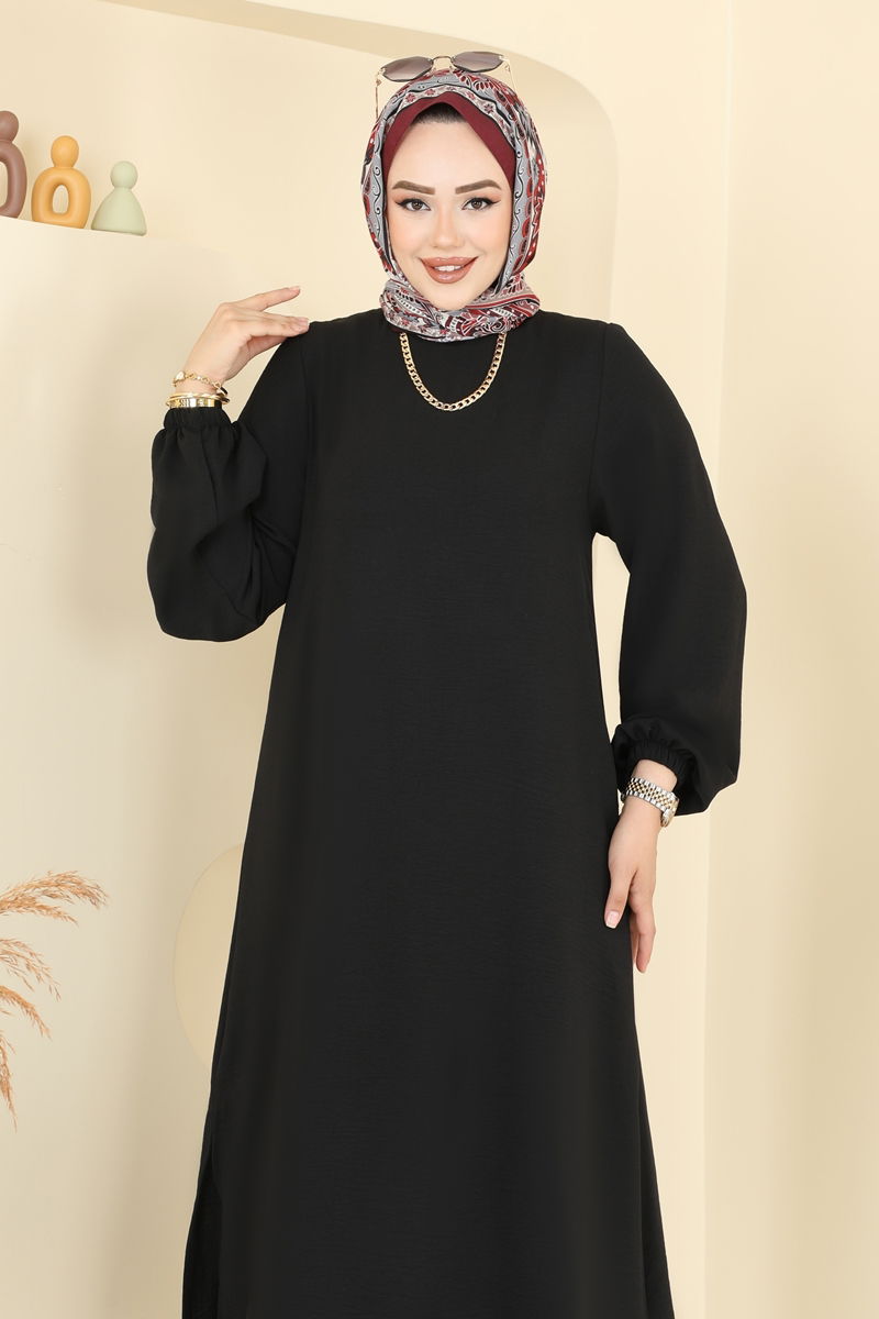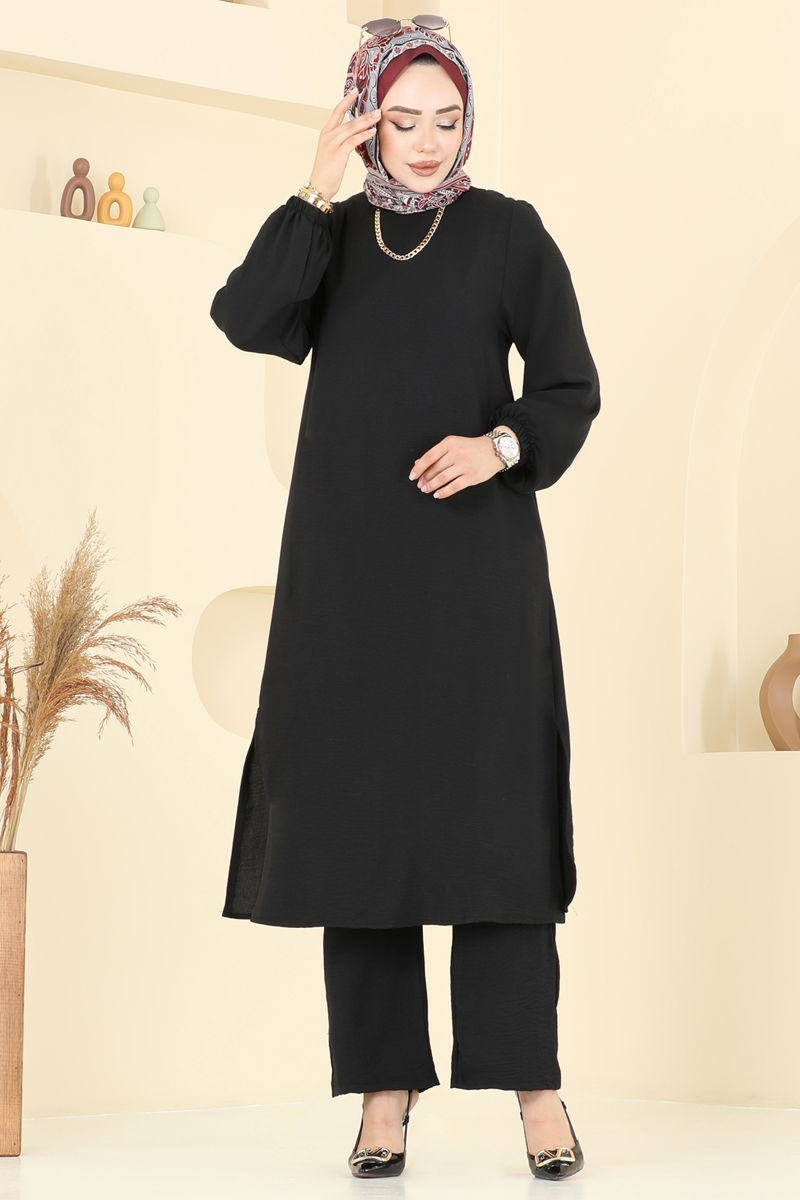 Yandan yırtmaçlı siyah takım, zarif ve modern bir tesettür giyim seçeneğidir. Her sezon rahatlıkla tercih edebileceğiniz bu takım, aerobin kumaşın sunduğu esneklik ve konforu garanti eder. 30 derece hassas yıkama önerisiyle uzun süreli kullanım sunar. Bisiklet yakalı tunik ve yırtmaç detayları ile dikkat çekerken, lastik paçalı pantolon konforunu artsırır. Günlük kullanımlarınızdan özel günlerinize kadar her alanda idealdir.