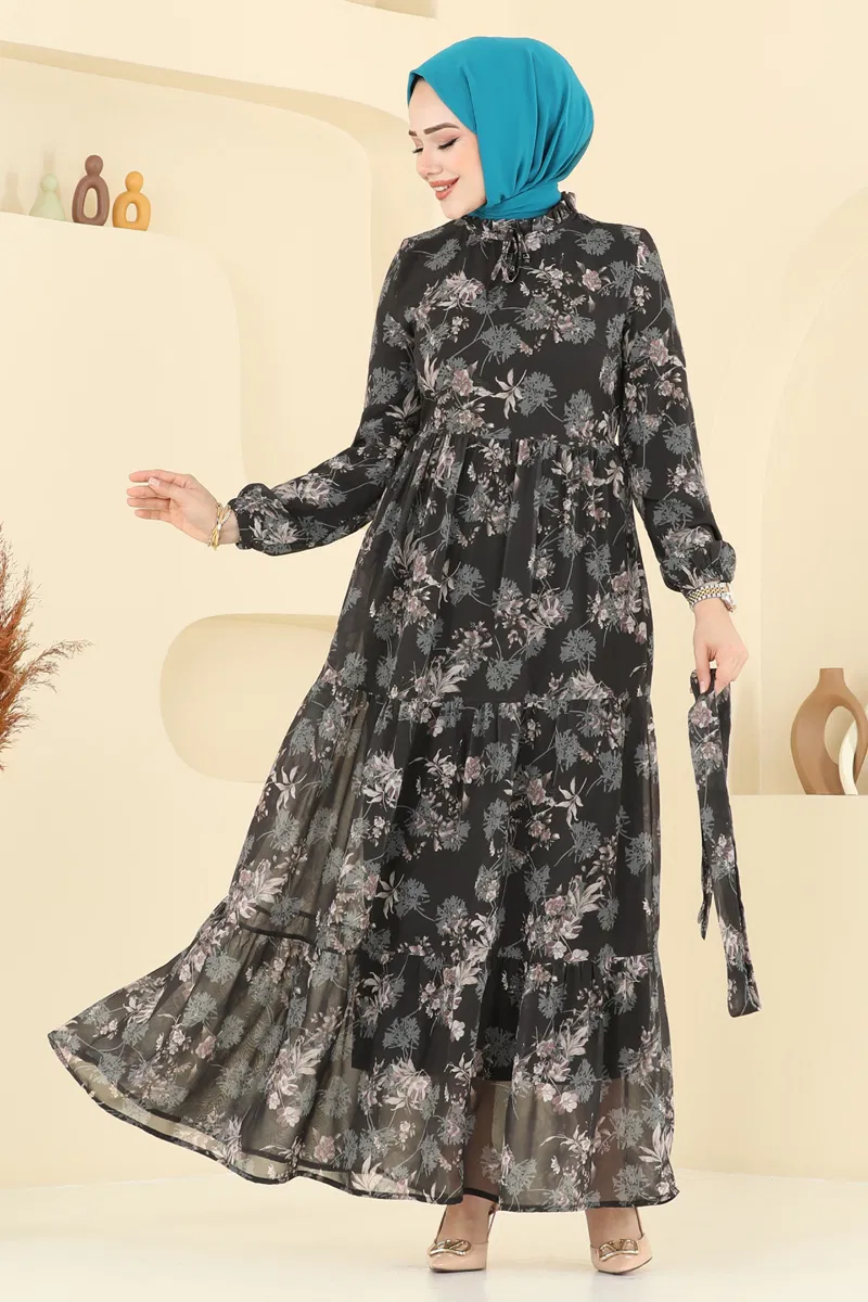 Yaprak Desen Şifon Elbise 5205AL357-MS Siyah