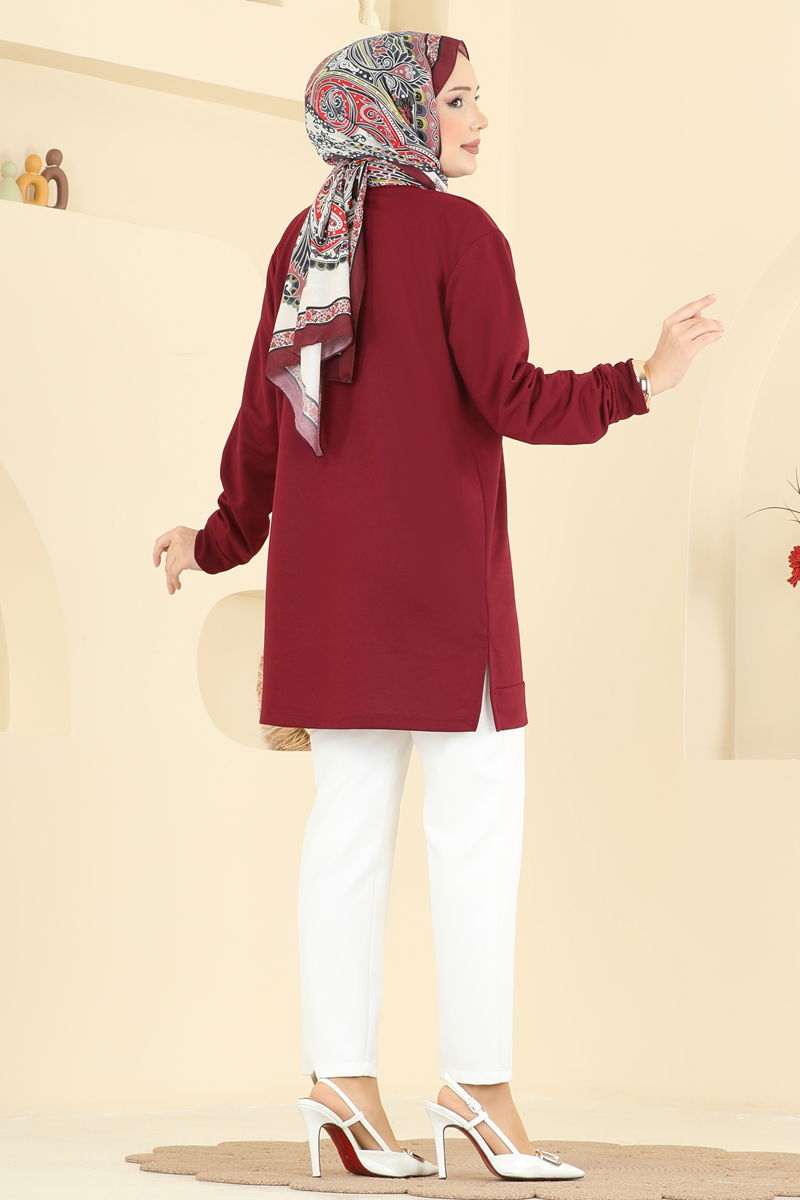 Bordo İki İplik Yaprak Desenli Tunik