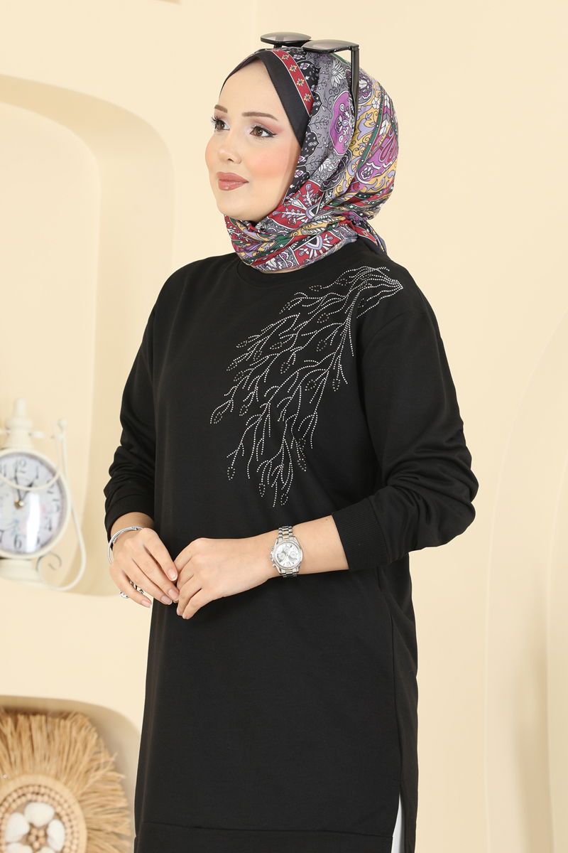 Siyah Yaprak Desenli İki İplik Tunik