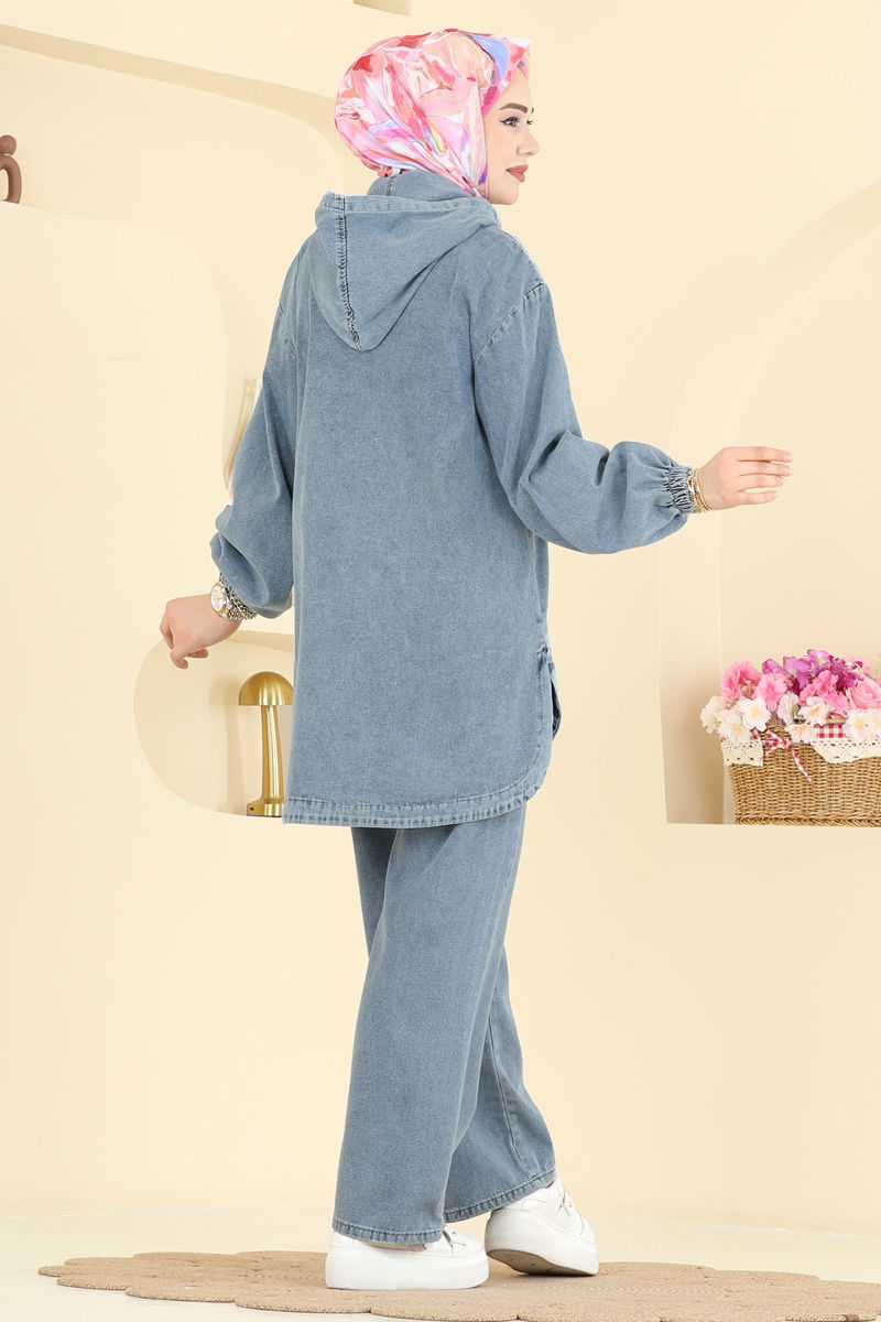 Yarım Çıtçıtlı Açık Kot Takım, tesettür giyim seçenekleri arasında dört mevsim keyifle kullanılabilecek bir üründür. 30 derece hassas yıkama ile temizlenmesi gereken bu takım, dayanıklı kot malzemesi sayesinde uzun süreli kullanım sunar. Kapşonlu ve çıtçıtlı tasarımıyla modern bir estetik sergilerken, elastik beli ve cepli pantolonu ile kullanıcıya konfor sağlar. Kol ucu lastikli bu takım, şıklığı konforla birleştirmek isteyenler için mükemmel bir tercihtir.
