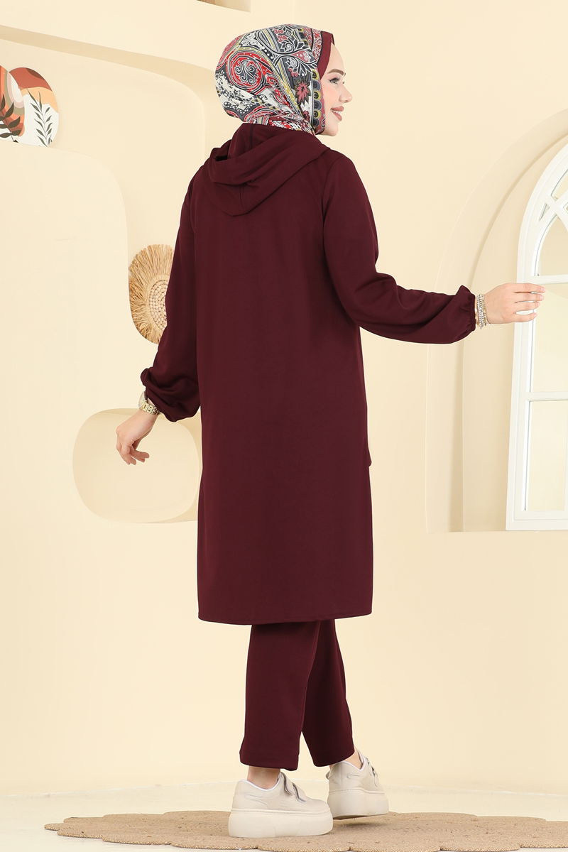 Bordo Yarı Çıtçıtlı Krep Takım, tesettürlü kadınlar için tasarlanmış şık ve konforlu bir tercihtir. Bu takım, özel dört mevsimlik kullanıma uygun örme krep kumaştan üretilmiştir. Ürün, kapşonlu ve çıtçıtlı tasarımı ile modern bir görünüm sağlar. Yanları yırtmaçlı tunik ve elastik bel pantolon, günlük kullanım için idealdir. Tasarım, aktif yaka bağcığı ile tamamlanmıştır.