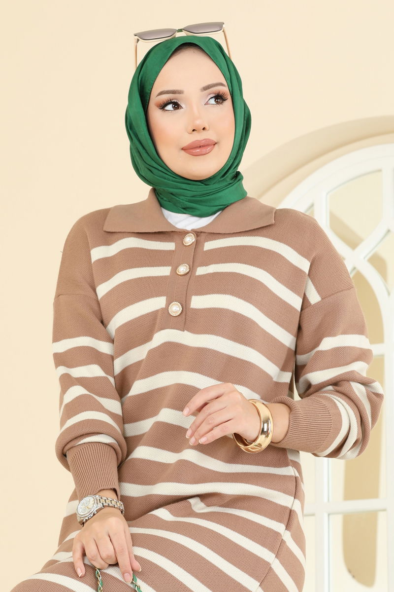 Yarım Düğmeli Çizgili Triko Elbise 502OZN1046-MS Bisküvi