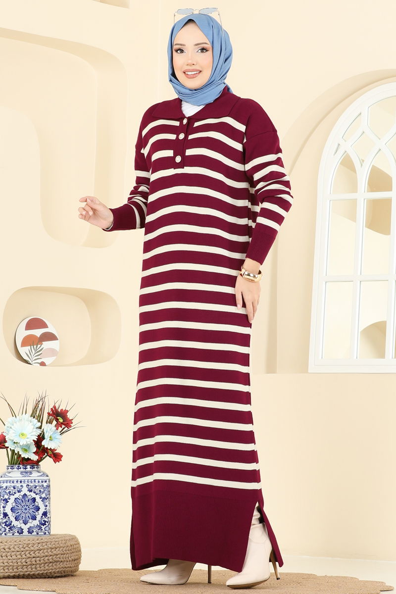 Yarım Düğmeli Çizgili Triko Elbise 502OZN1046-MS Bordo