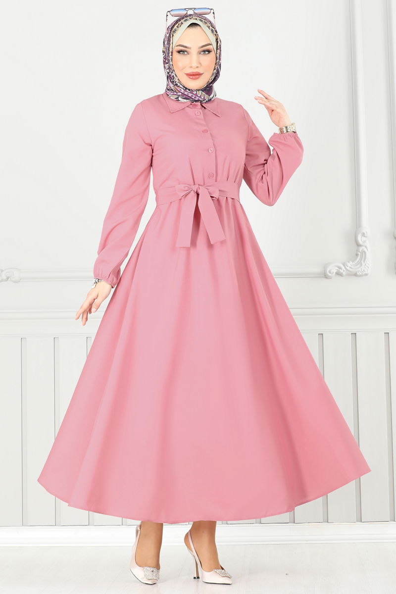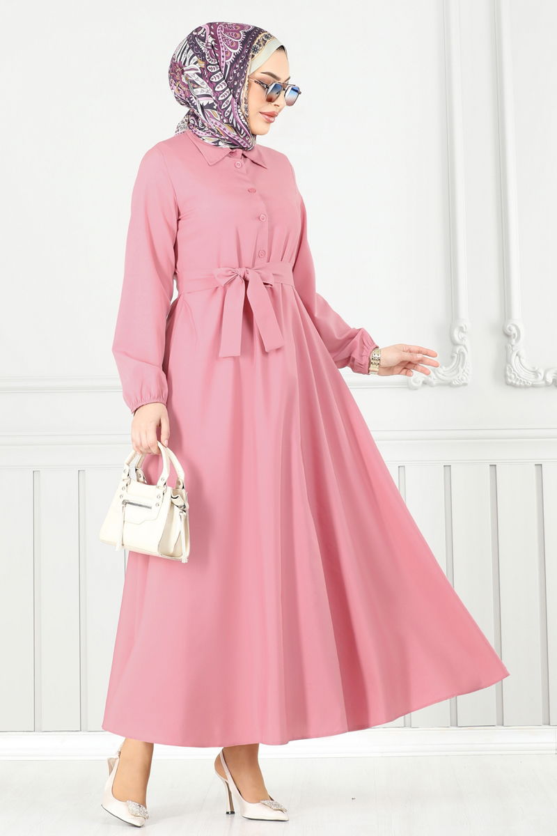 Ürün Detayları: Moda tesettür tasarımıdır. Ön kısmı yarım düğmeli ve gömlek yaka formunda olan bu elbise, astarsız yapısıyla dikkat çeker. Ürüne eşlik eden kemer isteğe bağlı kullanılabilir. Elbise manşetleri lastikli olup, renk tonu çekimlerden ötürü farklılık gösterebilir.
