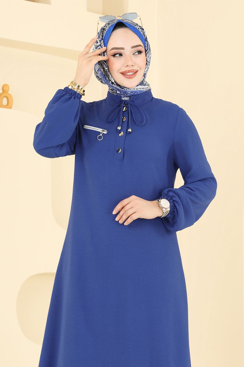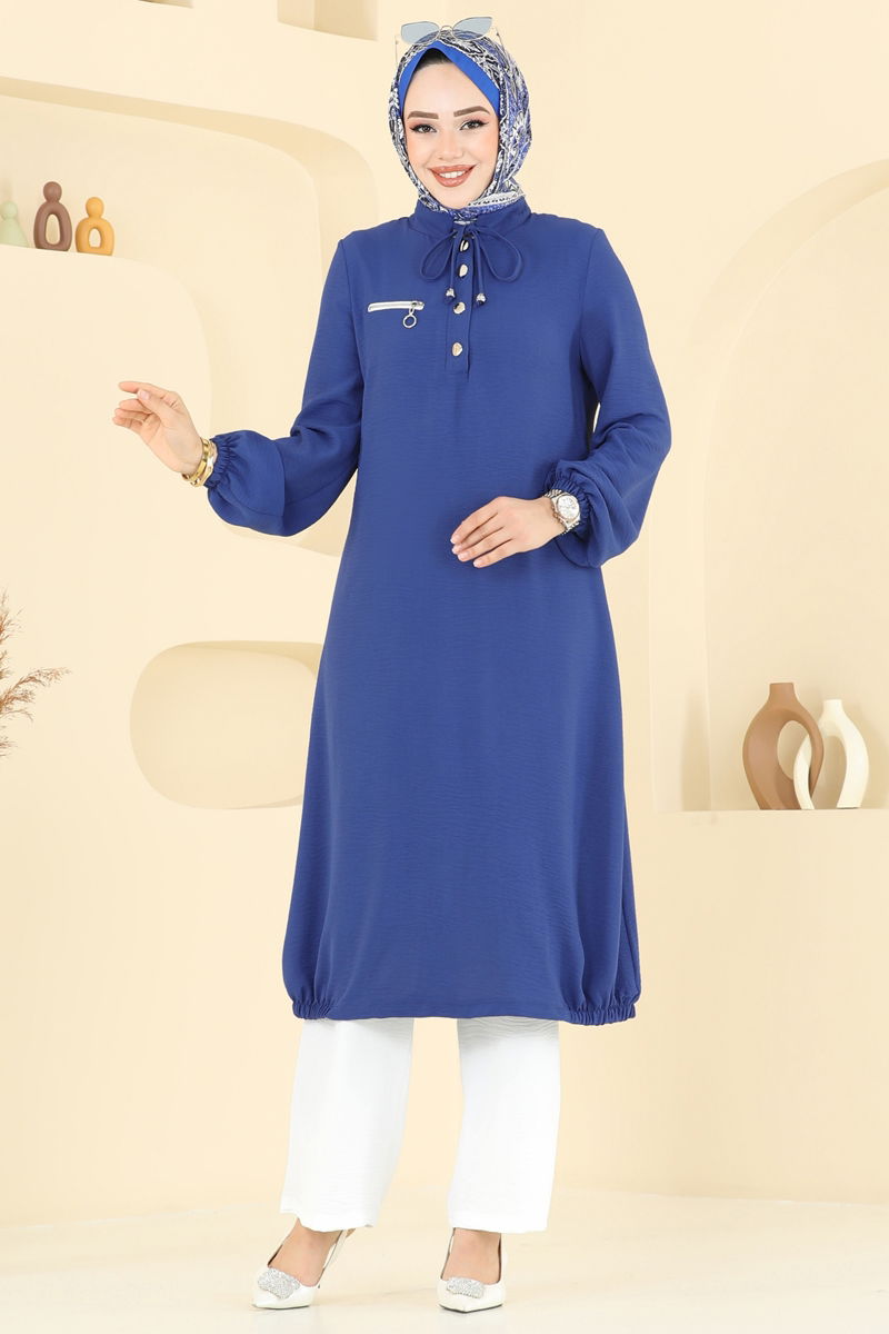 Button Detailed Hijab Outfit; this stylish design, suitable for all seasons, is made from aerobin fabric. It can be washed at 30 degrees with delicate wash. It offers a modern look with a semi-mandarin collar and half-buttoned front design. Elastic details are included at the hem of the tunic and the cuffs of the pants, while the tie and zipper details are merely added as accessories. This outfit combines comfort and elegance.