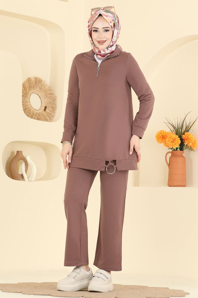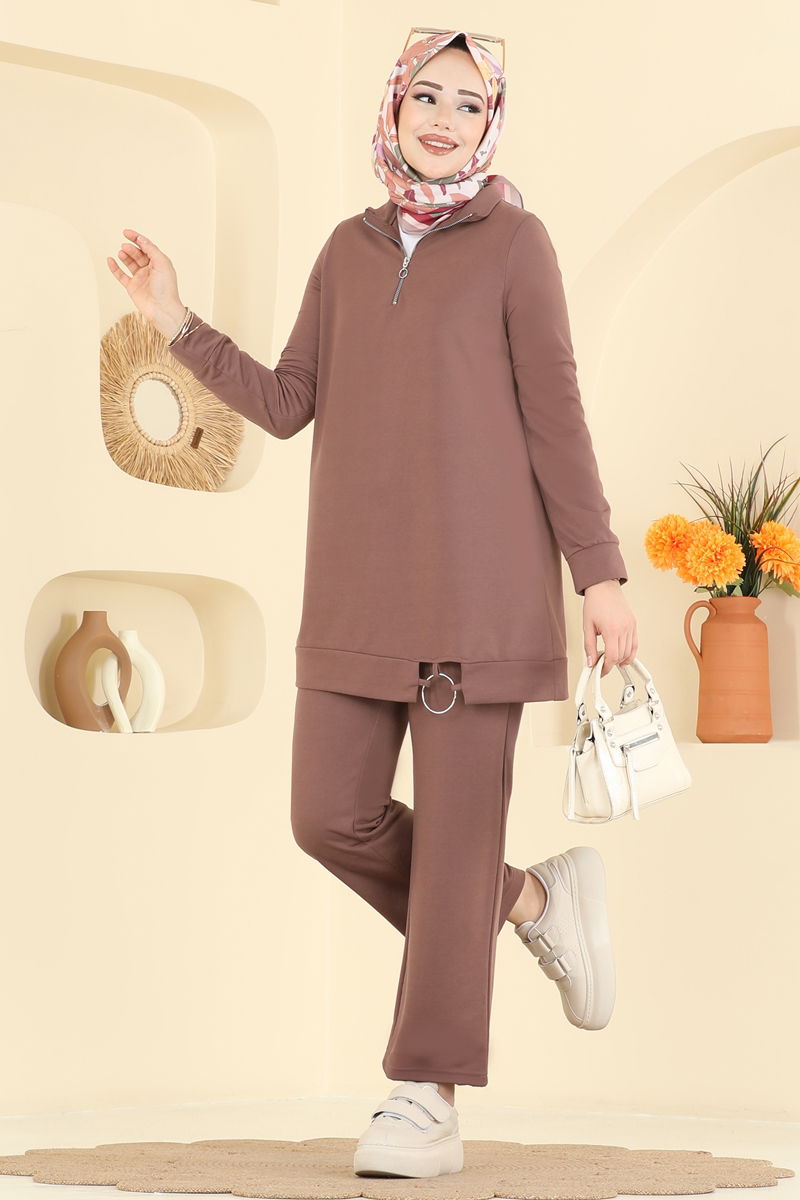 Yarım Fermuarlı Spor Takım; tesettür modası için tasarlanmış, yılın dört mevsimi tercih edebileceğiniz bir üründür. 30 derecede, sıkma yapılmadan yıkanmalıdır. Kaliteli İki İplik kumaştan üretilmiştir. Model hakim yakaya sahiptir ve astarsızdır. (Modelin giydiği ürün 38 bedendir.) Fermuar, ön kısımda ve kullanım kolaylığı sağlar. Pantolonun beli elastik ve rahattır.