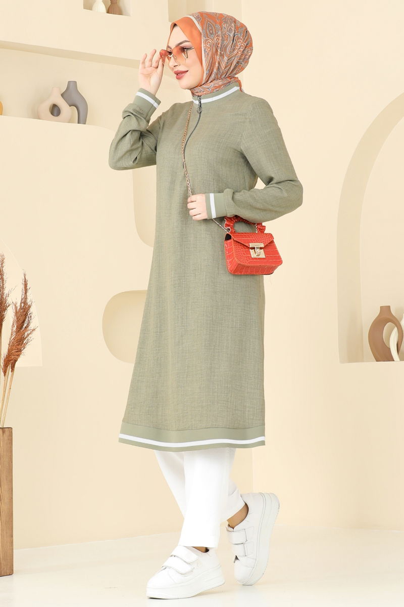 Ürün Nitelikleri :Moda öncüsü tesettür giyim modelidir. Pratik kullanım için fermuar detayı mevcuttur. Üründeki yaka tipi Bisiklet yakadır ve astarsızdır. Pantolonun bel kısmında esneklik sağlayan lastik kullanılmıştır. Çekim tekniklerinden dolayı renkte değişiklikler olabilir.