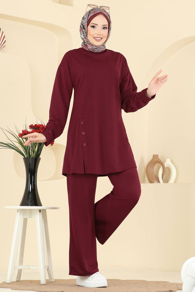 Ürün Ayrıntıları: En yeni tesettür giyim trendlerinden biridir. Arka kısmında kullanım için düğme detayı mevcuttur. Ürünün yaka tipi Bisiklettir. Tunik ön kısmında yırtmaç detayına sahiptir. Astarsız bir yapıdadır. Pantolonun bel kısmı lastiklidir. Kollardaki düğmeler dekoratif amaçlıdır.Resim çekimlerindeki ışıklandırmadan dolayı renk farklılıkları oluşabilir.