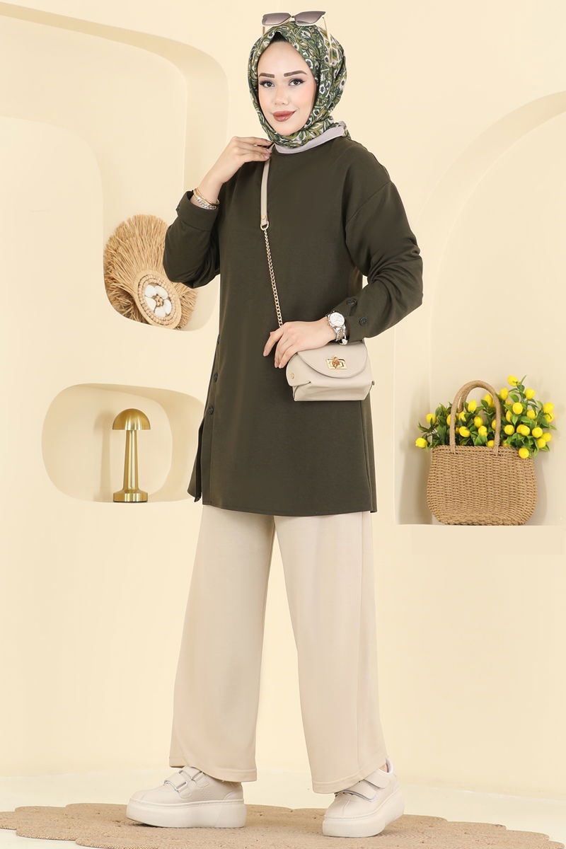 Ürün Detayları : Yeni sezon tesettür giyim ürünüdür. Arka kısmında kullanılabilir düğme detayı mevcuttur. Ürünün yaka tipi bisiklet yakadır. Tunik ön kısımda yırtmaç detayına sahiptir. Astar içermemektedir. Pantolonun bel kısmı lastiklidir. Kol ağızlarında bulunan düğmeler dekoratif amaçlıdır.Fotoğraf çekimleri sebebiyle ufak ton farklılıkları görülebilir.