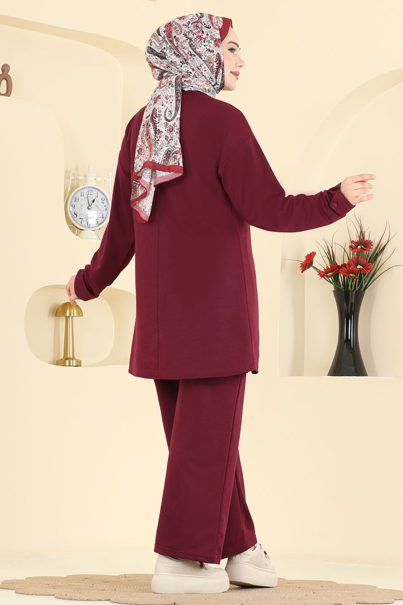 Koyu Bordo Yırtmaç Detaylı ve Düğmeli Aksesuarlı Takım