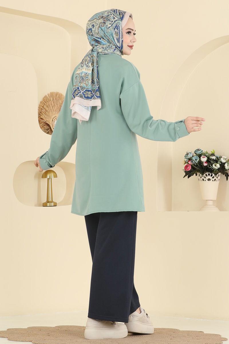 Bu Mint&Laci renkli takım elbise, dört mevsim boyunca tercih edebileceğiniz şık bir tesettür koleksiyon parçasıdır. İki iplik kumaştan üretilen bu elbise, bisiklet yakasına ve rahat bel yapısına sahip pantolonu sayesinde, stil ve konforu birleştirir. Ön yırtmaç ve kolları süsleyen aksesuar düğmeler dikkat çekerken, 30 derece hassas yıkama ile temizlenebilir. Modelin üzerindeki 38 beden olan ürün, arka kısımda bulunan fonksiyonel bir düğme ile tamamlanmıştır.