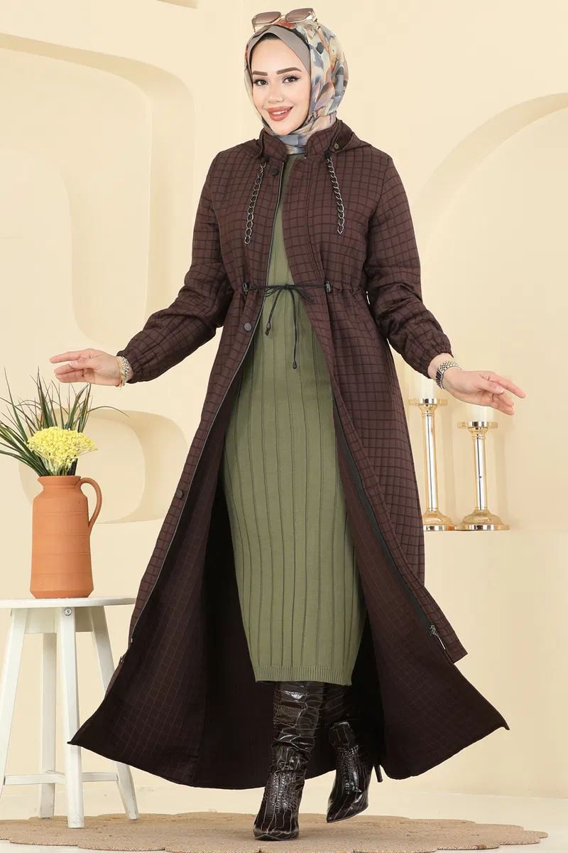 Zincir detaylarıyla öne çıkan Kapitone Ferace modeli, kahve rengi ile dikkat çekiyor! Kış aylarında sizi ısıtacak kapitone kumaş, şık ve modern tasarımı ile dikkat çeker. Gizli düğmeli ve kapüşonlu tasarımı ile stili ve konforu bir arada sunar. Belindeki ayarlanabilir bağcıklar sayesinde vücuda mükemmel uyum sağlar, isteğe bağlı çıkarılabilir kapüşonu ile farklı bir kullanım sunar. Metal zincir askıları ve öndeki saklı fermuar hem şıklık hem de pratik bir kullanım imkanı tanır. Fonksiyonel cepleri ve elastik manşetleri ile gün boyu rahatlık sağlar. Kış koleksiyonunuzun en iddialı parçası olacak bu feraceyi kaçırmayın!